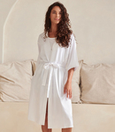 95% polyester/5% elastane. Kimono style robe.3/4 length sleeves.Self fabric tie front.Side pockets.Below knee length.No label.Suitable for sublimation printing.